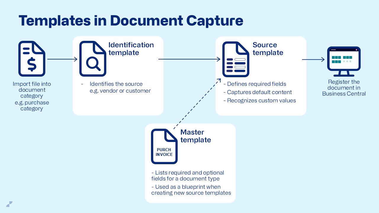 For Continia Document Capture to capture the fields of imported documents, each document must be linked to a document template. A document template is essentially a collection of rules and configurations that determine how documents should be captured and processed. There are three types of templates in Document Capture, two of which are document templates: